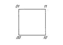 Состояние сети - это просто множество текущих значений сигналов OUT от всех нейронов. В первоначальной сети Хопфилда состояние каждого нейрона менялось в дискретные случайные моменты времени, в последующей работе состояния нейронов могли меняться одновременно. Так как выходом бинарного нейрона может быть только ноль или единица (промежуточных уровней нет), то текущее состояние сети является двоичным числом, каждый бит которого является сигналом OUT некоторого нейрона. Функционирование сети легко визуализируется геометрически. На рис. 6.2 а показан случай двух нейронов в выходном слое, причем каждой вершине квадрата соответствует одно из четырех состояний системы (00, 01, 10, II). На рис. 6.2 б показана трехнейронная система, представленная кубом (в трехмерном пространстве), имеющим восемь вершин, каждая из которых помечена трехбитовым бинарным числом. В общем случае система с п нейронами имеет 2n различных состояний и представляется fi-мерным гиперкубом.
