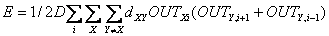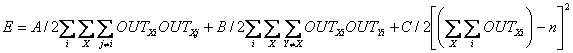 функция энергии должна удовлетворять двум требованиям: во-первых, должна быть малой только для тех решений, которые имеют по одной единице в каждой строке и каждом столбце; во-вторых, должна оказывать предпочтение решениям с короткой длиной маршрута. Первое требование удовлетворяется введением следующей, состоящей из трех сумм, функции энергии: