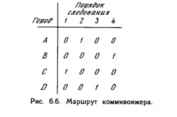 Заметим, что этот член представляет собой длину любого допустимого маршрута. Для удобства индексы определяются по модулю п, т.е. OUTn+j = OUTj, a D - некоторая константа. При достаточно больших значениях А, В и С низкоэнергетические состояния будут представлять допустимые маршруты, а большие значения D гарантируют, что будет найден короткий маршрут. Теперь зададим значения весов, т.е. установим соответствие между членами в функции энергии и членами общей формы (см. уравнение 6.2)).