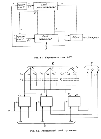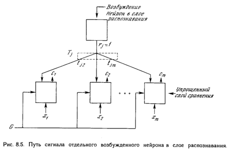 Алгоритмы инициализации и обучения построены таким образом, что каждый весовой вектор Тj. имеет двоичные значения весов; кроме того, каждый весовой вектор Вj представляет собой масштабированную версию соответствующего вектора Тj. Это означает, что все компоненты Р (вектора возбуждения слоя сравнения) также являются двоичными величинами. Так как вектор R не является больше нулевым, сигнал G1 устанавливается в нуль. Таким образом, в соответствии с правилом двух третей, возбудиться могут только нейроны, получающие на входе одновременно единицы от входного вектора Х и вектора Р. Другими словами, обратная связь от распознающего слоя действует таким образом, чтобы установить компоненты С в нуль в случае, если входной вектор не соответствует входному образу, т.е. если Х и Р не имеют совпадающих компонент. Если имеются существенные различия между Х и Р