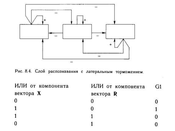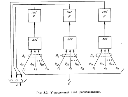 Слой распознавания. Слой распознавания осуществляет классификацию входных векторов. Каждый нейрон в слое распознавания имеет соответствующий вектор весов Вj.Только один нейрон с весовым вектором, наиболее соответствующим входному вектору, возбуждается; все остальные нейроны заторможены. Как показано на рис. 8.3, нейрон в распознающем слое имеет максимальную реакцию, если вектор С, являющийся выходом слоя сравнения, соответствует набору его весов, следовательно, веса представляют запомненный образ или экземпляр для категории входных векторов. Эти веса являются действительными числами, а не двоичными величинами. Двоичная версия этого образа также запоминается в соответствующем наборе весов слоя сравнения (рис. 8.2); этот набор состоит из весов связей, соединяющих определенные нейроны слоя распознавания, один вес на каждый нейрон слоя сравнения. В процессе функционирования каждый нейрон слоя распознавания вычисляет свертку вектора собственных весов и входного вектора С. Нейрон, имеющий веса, наиболее близкие вектору С, будет иметь самый большой выход, тем самым выигрывая соревнование и одновременно затормаживая все остальные нейроны в слое. Как показано на рис. 8.4, нейроны внутри слоя распознавания взаимно соединены в латерально-тормозящую сеть. В простейшем случае (единственном, рассмотренном в данной работе) предусматривается, что только один нейрон в слое возбуждается в каждый момент времени (т.е. только нейрон с наивысшим уровнем активации будет иметь единичный выход; все остальные нейроны будут иметь нулевой выход). Эта конкуренция реализуется введением связей с отрицательными весами lij с выхода каждого нейрона ri. на входы остальных нейронов. Таким образом, если нейрон имеет большой выход, он тормозит все остальные нейроны в слое. Кроме того, каждый нейрон имеет связь с положительным весом со своего выхода на свой собственный вход. Если нейрон имеет единичный выходной уровень, эта обратная связь стремится усилить и поддержать его.