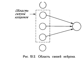 На рис. 10.2 показано, что каждый нейрон связан только с нейронами в соседней области, называемой областью связи. Это ограничение области связи согласуется с анатомией зрительной коры, в которой редко соединяются между собой нейроны, располагающиеся друг от друга на расстоянии более одного миллиметра. В рассматриваемой модели нейроны упорядочены в виде слоев со связями от одного слоя к следующему. Это также аналогично послойной структуре зрительной коры и других частей головного мозга.