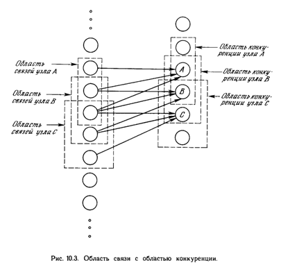 Так как когнитрон реализован в виде многослойной сети, возникают сложные проблемы обучения, связанные с выбранной структурой. Автор отверг управляемое обучение, как биологически неправдоподобное, используя взамен этого обучение без учителя. Получая обучающий набор входных образов, сеть самоорганизуется посредством изменения силы синаптических связей. При этом отсутствуют предварительно определенные выходные образы, представляющие требуемую реакцию сети, однако сеть самонастраивается с целью распознавания входных образов с замечательной точностью. Алгоритм обучения когнитрона является концептуально привлекательным. В заданной области слоя обучается только наиболее сильно возбужденный нейрон. Автор сравнивает это с «элитным обучением», при котором обучаются только «умные» элементы. Те нейроны, которые уже хорошо обучены, что выражается силой их возбуждения, получат приращение силы своих синапсов с целью дальнейшего усиления своего возбуждения. На рис. 10.3 показано, что области связи соседних узлов значительно перекрываются. Это расточительное дублирование функций оправдывается взаимной конкуренцией между ближайшими узлами. Даже если узлы в начальный момент имеют абсолютно идентичный выход, небольшие отклонения всегда имеют место; один из узлов всегда будет иметь более сильную реакцию на входной образ, чем соседние. Его сильное возбуждение будет оказывать сдерживающее воздействие на возбуждение соседних узлов, и только его синапсы будут усиливаться; синапсы соседних узлов останутся неизменными.