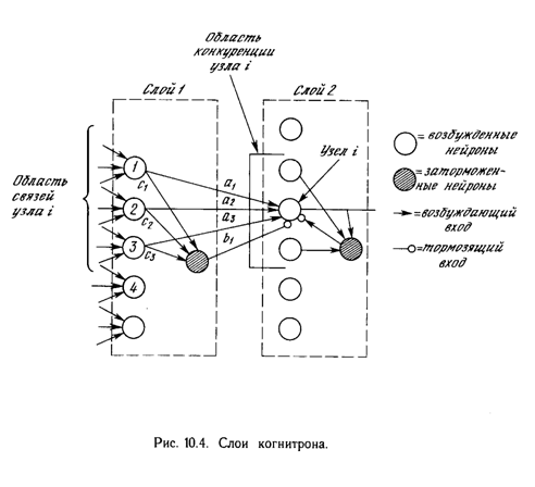 В когнитроне слой состоит из возбуждающих и тормозящих узлов. Как показано на рис. 10.4, нейрон слоя 2 имеет область связи, для которой он имеет синаптические соединения с набором выходов нейронов в слое 1. Аналогично в слое 1 существует тормозящий нейрон, имеющий ту же область связи. Синаптические веса тормозящих узлов не изменяются в процессе обучения; их веса заранее установлены таким образом, что сумма весов в любом из тормозящих нейронов равна единице. В соответствии с этими ограничениями, выход тормозящего узла INHIB является взвешенной суммой его входов, которые в данном случае представляют собой среднее арифметическое выходов возбуждающих нейронов, к которым он подсоединен. Таким образом,