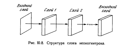 Неокогнитрон имеет иерархическую структуру, ориентированную на моделирование зрительной системы человека. Он состоит из последовательности обрабатывающих слоев, организованных в иерархическую структуру (рис. 10.8). Входной образ подается на первый слой и передается через плоскости, соответствующие последующим слоям, до тех пор, пока не достигнет выходного слоя, в котором идентифицируется распознаваемый образ.