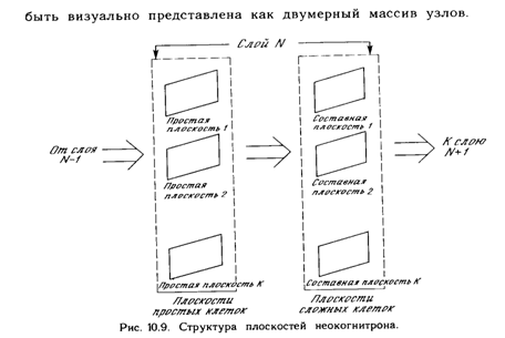 Слои. Каждый слой неокогнитрона состоит из двух массивов плоскостей (рис. 10.9). Массив плоскостей, содержащих простые узлы, получает выходы предыдущего слоя, выделяет определенные образы и затем передает их в массив плоскостей, содержащих комплексные узлы, где они обрабатываются таким образом, чтобы сделать выделенные образы менее позиционно зависимыми.
