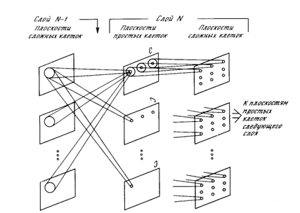 Комплексные узлы. Задачей комплексных узлов является уменьшение зависимости реакции системы от позиции образов во входном поле. Для достижения этого каждый комплексный узел получает в качестве входного образа выходы набора простых узлов из соответствующей плоскости того же слоя. Эти простые узлы покрывают непрерывную область простой плоскости, называемую рецептивной областью комплексного узла. Возбуждение любого простого узла в этой области является достаточным для возбуждения данного комплексного узла. Таким образом, комплексный узел реагирует на тот же образ, что и простые узлы в соответствующей ему плоскости, но он менее чувствителен к позиции образа, чем любой из них. Таким образом, каждый слой комплексных узлов реагирует на более широкую область входного образа, чем это делалось в предшествующих слоях. Эта прогрессия возрастает линейно от слоя к слою, приводя к требуемому уменьшению позиционной чувствительности системы в целом.