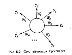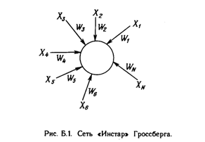 Много общих идей, используемых в искусственных нейронных сетях, прослеживаются в работах Гроссберга; в качестве примера можно указать конфигурации входных и выходных звезд [1], используемые во многих сетевых парадигмах. Входная звезда, как показано на рис. Б.1, состоит из нейрона, на который подается группа входов через синапсические веса. Выходная звезда, показанная на рис. Б.2, является нейроном, управляющим группой весов. Входные и выходные звезды могут быть взаимно соединены в сети любой сложности; Гроссберг рассматривает их как модель определенных биологических функций. Вид звезды определяет ее название, однако звезды обычно изображаются в сети иначе.