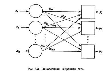 В 1957 г. Розенблатт [4] разработал модель, которая вызвала большой интерес у исследователей. Несмотря на некоторые ограничения ее исходной формы, она стала основой для многих современных, наиболее сложных алгоритмов обучения с учителем. Персептрон является настолько важным, что вся гл. 2 посвящена его описанию; однако это описание является кратким и приводится в формате, несколько отличном от используемого в [4]. Персептрон является двухуровневой, нерекуррентной сетью, вид которой показан на рис. Б.З. Она использует алгоритм обучения с учителем; другими словами, обучающая выборка состоит из множества входных векторов, для каждого из которых указан свой требуемый вектор цели. Компоненты входного вектора представлены непрерывным диапазоном значений; компоненты вектора цели являются двоичными величинами (0 или 1). После обучения сеть получает на входе набор непрерывных входов и вырабатывает требуемый выход в виде вектора с бинарными компонентами. Обучение осуществляется следующим образом: 1. Рандомизируются все веса сети в малые величины. 2. На вход сети подается входной обучающий вектор Х и вычисляется сигнал NET от каждого нейрона, используя стандартное выражение