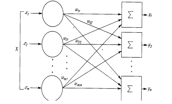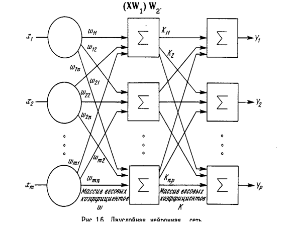 Хотя один нейрон и способен выполнять простейшие процедуры распознавания, сила нейронных вычислений проистекает от соединений нейронов в сетях. Простейшая сеть состоит из группы нейронов, образующих слой, как показано в правой части рис. 1.5. Отметим, что вершины-круги слева служат лишь для распределения входных сигналов. Они не выполняют каких- либо вычислений, и поэтому не будут считаться слоем. По этой причине они обозначены кругами, чтобы отличать их от вычисляющих нейронов, обозначенных квадратами. Каждый элемент из множества входов Х отдельным весом соединен с каждым искусственным нейроном. А каждый нейрон выдает взвешенную сумму входов в сеть. В искусственных и биологических сетях многие соединения могут отсутствовать, все соединения показаны в целях общности. Могут иметь место также соединения между выходами и входами элементов в слое. Такие конфигурации рассматриваются в гл. 6. Удобно считать веса элементами матрицы W. Матрица имеет т строк и п столбцов, где т. - число входов, а п - число нейронов. Например, w3,2 - это вес, связывающий третий вход со вторым нейроном. Таким образом, вычисление выходного вектора N, компонентами которого являются выходы OUT нейронов, сводится к матричному умножению N = XW, где N и Х- векторы-строки.