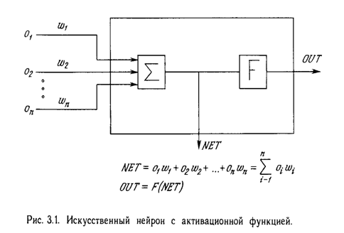 Нейрон. На рис. 3.1 показан нейрон, используемый в качестве основного строительного блока в сетях обратного распространения. Подается множество входов, идущих либо извне, либо от предшествующего слоя. Каждый из них умножается на вес, и произведения суммируются. Эта сумма, обозначаемая NET, должна быть вычислена для каждого нейрона сети. После того, как величина NET вычислена, она модифицируется с помощью активационной функции и получается сигнал OUT.