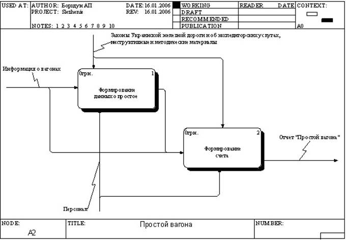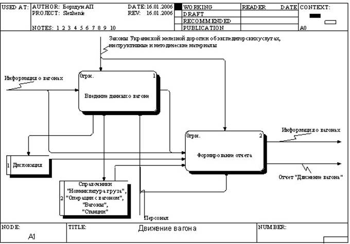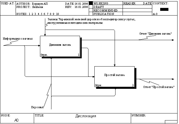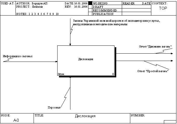 Согласно описаниям системы основной функцией является учет информации (движение, данные, простой) о вагонах. Таким образом, определяем единственную работу контекстной диаграммы «Слежение за вагонами» («Дислокация»). Дальше определим входные и исходные данные, а также механизм и управление.