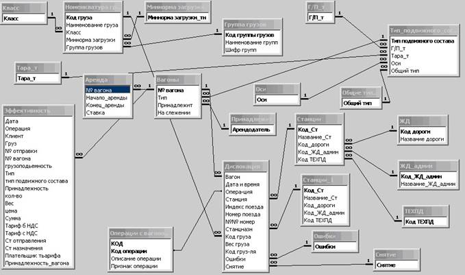 Для создания логической и физической моделей автоматизируемого комплекса задач воспользуемся возможностью СУБД Access 2003. Схема–данных представлена на рис. 1.5.