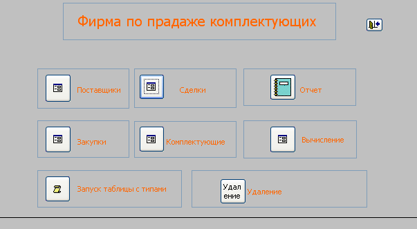 При загрузке базы данных на экране появляется заставка, которая через пять секунд закрывается и открывается главная кнопочная форма, которая содержит следующие кнопки: Поставщики, Сделки, Закупки, Комплектующие, Отчет, Вычисление, Запуск таблицы с типами, Удаление. Главная форма показана на рисунке 8.