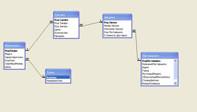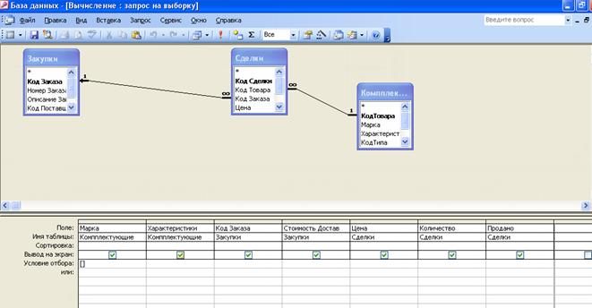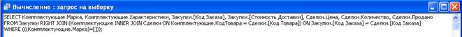 FROM Типы RIGHT JOIN ((Поставщики RIGHT JOIN Закупки ON Поставщики.КодПоставщика = Закупки.[Код Поставщика]) RIGHT JOIN (Компплектующие INNER JOIN Сделки ON Компплектующие.КодТовара = Сделки.[Код Товара]) ON Закупки.[Код Заказа] = Сделки.[Код Заказа]) ON Типы.КодТипа = Компплектующие.КодТипа