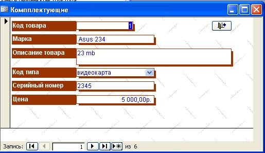 При выборе кнопки «Комплектующие» появляется форма, изображённая на рисунке 10, в которой можно добавлять, удалять, редактировать, сохранять данные. Также можно выйти из формы, нажав кнопку выхода.