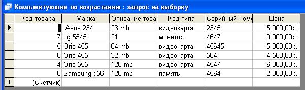 Запрос 4 «Упорядочивание по возрастанию комплектующие»