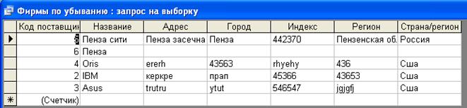 SELECT Поставщики.КодПоставщика, Поставщики.НазваниеПоставщика, Поставщики.Адрес, Поставщики.Город, Поставщики.ПочтовыйИндекс, Поставщики.ОбластьКрайРеспублика, Поставщики.[Страна/регион]