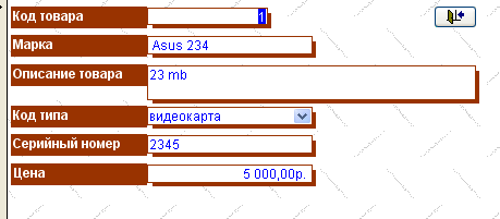 SELECT Компплектующие.КодТовара, Компплектующие.Марка, Компплектующие.Характеристики, Компплектующие.КодТипа, Компплектующие.СерийныйНомер, Компплектующие.Цена