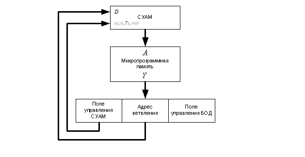 Адрес с выхода СУАМ поступает на адресные входы блока ПЗУ, и на выходных шинах микросхем появляется микрокоманда, поступающая в Рг.Мк.