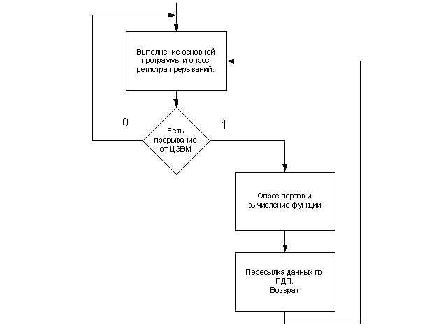 С учетом назначения разрабатываемого устройства (сбор и обработка информации), процесс взаимодействия центральной и периферийной ЭВМ можно обеспечить следующим образом: при поступлении запроса на прерывание от центральной ЭВМ, программа-обработчик данного прерывания производит опрос портов ввода-вывода данного прерывания и, в соответствии с алгоритмом вычисления заданной арифметической функции (ln x), производит обработку полученных данных. После этого периферийная ЭВМ инициирует запрос на прямой доступ к памяти и по каналу ПДП пересылает полученные в результате расчетов данные в ОЗУ центральной ЭВМ, после чего продолжает выполнение прерванной программы.