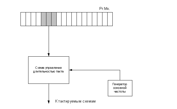 Для построения более эффективных вычислительных устройств может использован следующий метод: предлагается ввести в состав схемы микро ЭВМ схему управления длительностью такта. Структурная схема такого решения может быть представлена как показано на рис. 11.