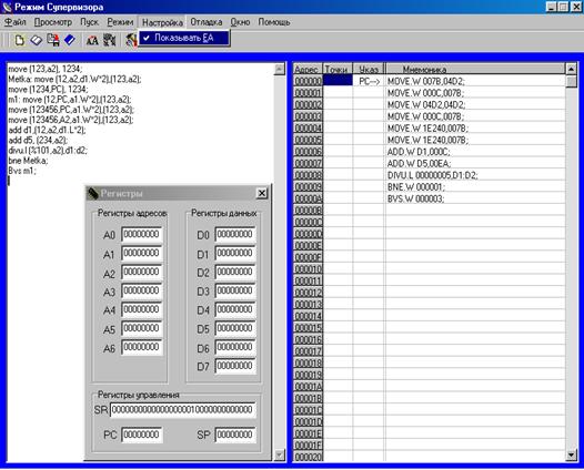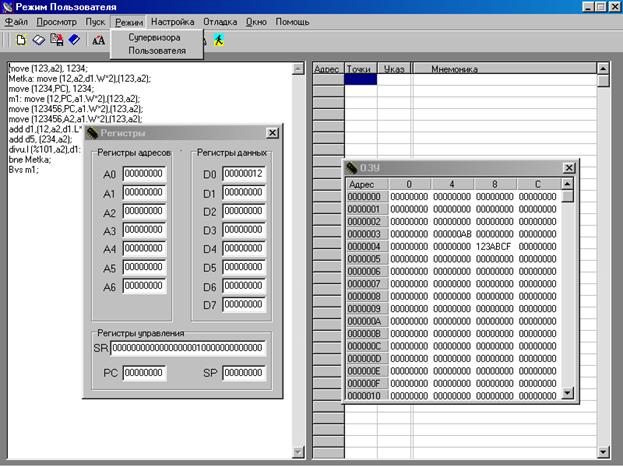 Основной экран программы состоит из двух окон: окно для ввода текста программы (диалоговое окно) и окно отладчика, в котором отражается адрес команды в памяти, положение указателя стека, мнемоника команды и её машинный код. Программная модель обладает возможностью просмотра и корректировки промежуточных результатов выполнения микропроцессорных программ. Для этой цели в неё включены возможности просмотра содержимого регистров микропроцессора. Осуществляется это путём выбора соответствующего подменю в выпадающем меню PopUp (Просмотр/Регистры). Микропроцессор имеет 17 32-разрядных регистров (восемь регистров данных, семь адресных регистров и два указателя стека). Кроме того, в нём есть 32-разрядный счётик команд, в котором используются только младшие 24 разряда. Регистр состояния микропроцессора имеет 16 разрядов. Все эти регистры отображены в соответствующем окне (рис. 2). Закрыть окна просмотра регистров можно щёлкнув на системную иконку закрытия окна или же выбрав в меню пункт “Окно”, ”Закрыть все”