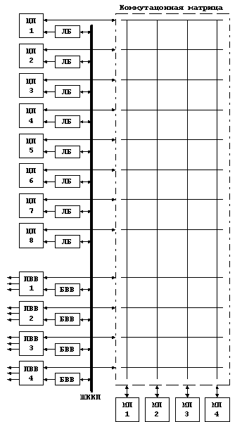 В МПВК с перекрестной коммутацией все связи осуществляются с помощью специального устройства – коммутационной матрицы. Коммутационная матрица позволяет связывать друг с другом любую пару устройств, причем таких пар может быть сколько угодно – связи не зависят друг от друга. Структурная схема МПВК приведена на рисунке: