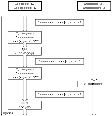Если вмешательства со стороны других процессов нет, ядро повторяет цикл до тех пор, пока значение семафора не станет больше или равно 0, ибо это означает, что в состоянии приостанова по семафору нет больше ни одного процесса. Тем не менее, нельзя исключить и такую возможность, что сразу после того, как процесс A при тестировании семафора на одноименном процессоре обнаружил нулевое значение семафора, процесс B на своем процессоре выполняет операцию P, уменьшая значение семафора до –1.