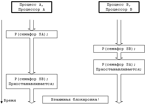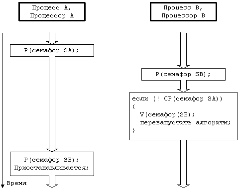 последовало бы возникновение тупиковой ситуации; процесс A на одноименном процессоре захватывает семафор SA, в то время как процесс B на своем процессоре захватывает семафор SB. Процесс A пытается захватить и семафор SB, но в результате операции P переходит в состояние приостанова, поскольку значение семафора SB не превышает 0. То же самое происходит с процессом B, когда последний пытается захватить семафор SA. Ни тот, ни другой процессы продолжаться уже не могут. Для предотвращения возникновения подобных ситуаций используются соответствующие алгоритмы обнаружения опасности взаимной блокировки, устанавливающие наличие опасной ситуации и ликвидирующие ее. Тем не менее, использование таких алгоритмов "утяжеляет" ядро. Поскольку число ситуаций, в которых процесс должен одновременно захватывать несколько семафоров, довольно ограничено, легче было бы реализовать алгоритмы, предупреждающие возникновение тупиковых ситуаций еще до того, как они будут иметь место. Если, к примеру, какой-то набор семафоров всегда блокируется в одном и том же порядке, тупиковая ситуация никогда не возникнет. Но в том случае, когда захвата семафоров в обратном порядке избежать не удается, операция CP предотвратит возникновение тупиковой ситуации: