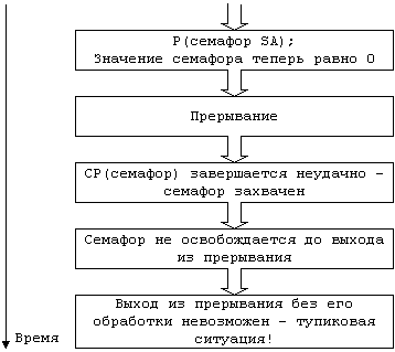 Операция повторяется в цикле до тех пор, пока значение семафора не превысит 0; программа обработки прерываний не приостанавливается и цикл завершается только тогда, когда значение семафора станет положительным, после чего это значение будет уменьшено операцией CP. Чтобы предотвратить ситуацию взаимной блокировки, ядру нужно запретить все прерывания, выполняющие "циклическую блокировку". Иначе выполнение процесса, захватившего семафор, будет прервано еще до того, как он сможет освободить семафор; если программа обработки прерываний попытается захватить этот семафор, используя "циклическую блокировку", ядро заблокирует само себя. В качестве примера обратимся к рисунку:
