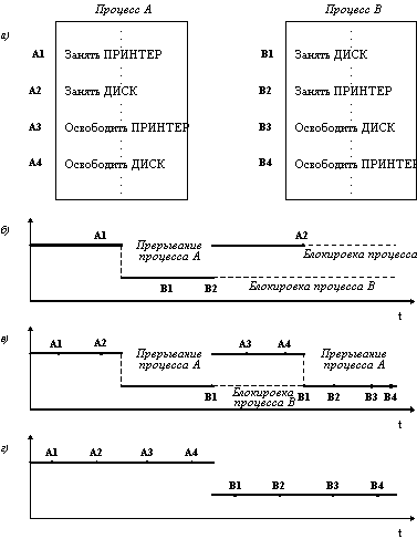 В зависимости от соотношения скоростей процессов, они могут либо совершенно независимо использовать разделяемые ресурсы (г), либо образовывать очереди к разделяемым ресурсам (в), либо взаимно блокировать друг друга (б). Тупиковые ситуации надо отличать от простых очередей, хотя и те и другие возникают при совместном использовании ресурсов и внешне выглядят похоже: процесс приостанавливается и ждет освобождения ресурса. Однако очередь - это нормальное явление, неотъемлемый признак высокого коэффициента использования ресурсов при случайном поступлении запросов. Она возникает тогда, когда ресурс недоступен в данный момент, но через некоторое время он освобождается, и процесс продолжает свое выполнение. Тупик же, что видно из его названия, является в некотором роде неразрешимой ситуацией.