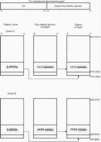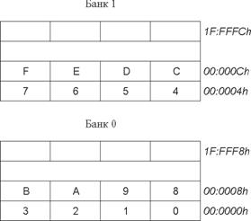 В системе с интерливингом —расслоением адресов ячеек памяти —весь объем памяти делится на два или несколько банков. Двойные слова с последовательными адресами располагаются в разных банках. Во время считывания информации из оперативной памяти за один цикл можно организовать параллельное извлечение информации из разных блоков, что уменьшает количество циклов ожидания.