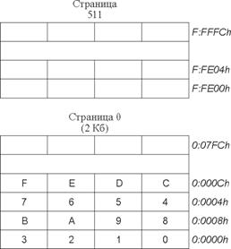 При страничной организации память делится на строки и столбцы. Адрес обращения к двойному слову содержит 9-ти разрядный номер строки и 9-ти разрядный номер столбца. При обращении к странице сигнал выбора номера строки поддерживается неизменным, а сигнал выбора столбца переставляется на столбец, откуда нужно прочитать данные.