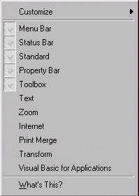 Рис. 2.3. Рабочее окно программы В центре окна программы расположен рисунок листа бумаги, называемый рабочей областью. Вы можете рисовать как внутри рабочей области, так и вне ее, но при выводе на печать будет напечатано только то, что находится внутри рабочей области. Полосы прокрутки позволяют передвигаться по изображению, а измерительные линейки - точно позиционировать элементы рисунка и измерять их размеры. Для работы с цветом в правой части окна расположена палитра цветов. В строке состояния выводится различная информация, существенно облегчающая работу с редактором. Основные средства для работы расположены в так называемых панелях инструментов. Кнопки в этих панелях позволяют быстро и легко выполнять любые операции в редакторе. Особенно интересна панель Property Bar (Панель свойств). Кнопки на этой панели появляются и пропадают, в зависимости от ваших действий. В любой момент времени вы найдете на панели свойств самые полезные в текущей ситуации инструменты. Чтобы расположить панель инструментов в произвольном месте, надо перетащить ее с помощью мыши. Панели можно расположить рядом с любой стороной окна или в произвольном месте рабочего окна. Кстати, меню тоже является панелью, и вы можете изменить его местоположение. Вы можете показать или убрать любую панель инструментов. Щелкните правой кнопкой мыши на свободном месте в любой панели инструментов, и рядом появится вспомогательное меню (Рис.2.4). Галочками в нем отмечены видимые панели. Выберите команду Standard (Основная) во вспомогательном меню, если напротив ее не стоит галочка, чтобы разместить на экране основную панель. Если вы не видите на экране меню, выберите команду Menu Bar (Панель меню), и меню появится в окне программы. Аналогично разместите Property Bar (Панель свойств), панель Toolbox (Графика) и Status Bar (Строка состояния) и уберите все прочие панели. Возможно, у вас и так видны именно эти панели, и вам не надо выполнять никаких действий.