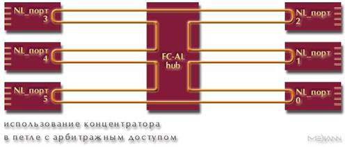 Классическая схема подключения до 126 портов, с которой все и начиналось, если судить по аббревиатуре FC-AL.