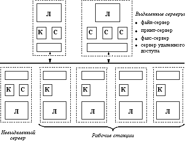 Выделенный сервер не принято использовать в качестве компьютера для выполнения текущих задач, не связанных с его основным назначением, так как это может уменьшить производительность его работы как сервера. В связи с такими соображениями в ОС Novell NetWare на серверной части возможность выполнения обычных прикладных программ вообще не предусмотрена, то есть сервер не содержит клиентской части, а на рабочих станциях отсутствуют серверные компоненты. Однако в других сетевых ОС функционирование на выделенном сервере клиентской части вполне возможно. Например, под управлением Windows NT Server могут запускаться обычные программы локального пользователя, которые могут потребовать выполнения клиентских функций ОС при появлении запросов к ресурсам других компьютеров сети. При этом рабочие станции, на которых установлена ОС Windows NT Workstation, могут выполнять функции невыделенного сервера.