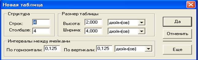 Каждый раз при запуске программы Adobe Table, а также в результате выбора команды "Файл" > "Новый ." на экране открывается диалоговое окно "Новая таблица" (рис.1), в котором вы можете задать необходимое количество строк и столбцов (не более 100), а также определить размер таблицы (максимальный размер - 40 х 40 дюймов). Кроме того, вы можете задать типы внешних и внутренних (ограничительных и разделительных) линий таблицы и установить ширину средников (расстояние между текстовыми блоками в соседних строках и столбцах). В процессе работы над таблицей вы можете в любой момент изменить любую из указанных характеристик.