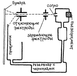 Для того чтобы направить струю чернил в определенные места на бумаге (или в приемник), необходимы отклоняющие электроды. Разумеется, что струя чернил должна электризоваться, предварительно пройдя через заряжающие электроды. Описанный выше принцип действия печатающего устройства использует сегодня очень небольшое количество принтеров. Самыми распространенными являются более прогрессивные технологии.