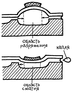 мации пьезокристалла под воздействием электрического поля. Изменение размеров пьезрэлемента, расположенного сбоку входного отверстия сопла, приводит к выбрасыванию капли и приливу через входное отверстие новой порции чернил (рисунок 5).