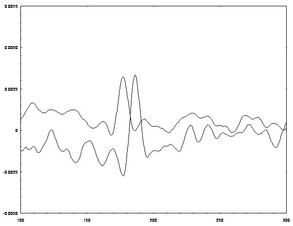Рис.6 Профили ПАВ на поверхности кремния. 1- гладкая поверхность, 2-неоднородная поверхность. | |