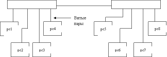 Рис.3. Структура сети Ethernet с двумя концентраторами