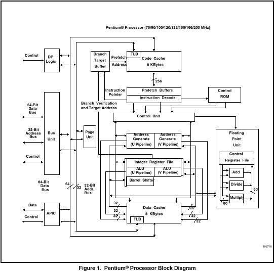 1. Суперскалярная архитектура – два параллельно работающих конвейера обработки позволяют одновременно обрабатывать до двух инструкций за такт. Конвейеры носят названия U и V. U-конвейер (U-pipeline) – это АЛУ с полным набором инструкций, он может исполнять все целочисленные инструкции и инструкции с плавающей точкой. V-конвейер (V-pipeline) – АЛУ с ограниченным набором инструкций, может исполнять только простые (выполняемые за один такт – MOV, INC, DEC и т.п.) инструкции – черты RISC-архитектуры.