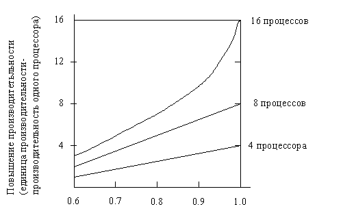 Необходимо отметить, что повышение производительности ММПС, которое может быть достигнуто за счет параллельной обработки, зависит от доли вычислений, которые могут выполняться параллельно. На рис. 5.3 иллюстрируется повышение производительности, которое может быть достигнуто при использовании различного количества процессоров, работающих параллельно, по сравнению с долей Р вычислений, которые могут выполняться параллельно.