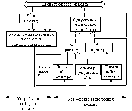 Блок выборки команд осуществляет опережающую выборку команд из основной памяти или кэша и помещает их в буфер предварительной выборки. Блок реализации команд принимает команды из буфера предварительной выборки и выполняет необходимые операции, после чего помещает результат в один из регистров, подготавливая последующее выполнение операции «регистр – регистр».