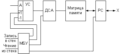 Выборка одной из ячеек матрицы памяти осуществляется через дешифратор адреса (ДСА) по адресу, находящемуся на реверсивном счетчике адреса, называемом указателем стека (УС). Начальное значение адреса поступает в УС на вход А. В процессе работы состояние УС при каждой записи уменьшается, а при каждом чтении увеличивается на единицу. Управление режимами записи и чтения выполняет местный блок управления (МБУ).