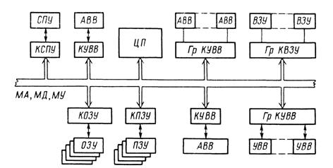 Все устройства ввода-вывода управляются контроллерами устройств ввода-вывода (КУВВ) или групповыми контроллерами устройствами ввода-вывода (ГрКУВВ). Оперативное (ОЗУ) и постоянное (ПЗУ) запоминающие устройства управляются с помощью соответствующих контроллеров (КОЗУ и КПЗУ). При такой организации центральный процессор (ЦП) обеспечивает программируемые контроллеры только управляющей информацией высокого уровня, детализируемой контроллерами. Поэтому количество управляющей информации на информационной магистрали системы резко уменьшается, что позволяет увеличить скорость передачи данных. По существу в этой схеме приведена многопроцессорная вычислительная система, в которой в пределе контроллер имеет те же возможности, что и центральный процессор. Низкая стоимость и высокая надежность БИС позволяют для достижения желаемых параметров ввести распределенное управление и распределенную обработку во всех подсистемах системы, что определяет новые способы организации вычислительных процессов в системах с децентрализованным управлением и обработкой информации.