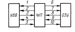 Связь МП с УВВ требует пять групп связей, обеспечиваемых через выводы корпуса МП. По группе шин 1 передается код выбора (адреса) устройства, по шине 2 – сигнал управления считыванием – записи, по шине 3 – сигнал запроса на прерывание, шины 4 и 5 используются для передачи данных от МП к УВВ и от УВВ к МП. Связь МП с ОЗУ также содержит пять групп связей, которые необходимо обеспечить через выводы корпуса МП. По группе шин 6 передается адрес в ОЗУ, шина 7 нужна для управления чтением/записью, по сигналам на шине 8 принимаются команды в МП, а шины 9 и 10 обеспечивают передачу данных из ОЗУ в МП и обратно.