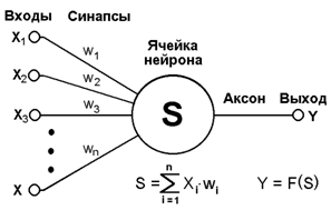 Из рисунка видно, что искусственный нейрон, так же как и живой, состоит из синапсов, связывающих входы нейрона с ядром, ядра нейрона, которое осуществляет обработку входных сигналов и аксона, который связывает нейрон с нейронами следующего слоя. Каждый синапс имеет вес, который определяет насколько соответствующий вход нейрона влияет на его состояние. Состояние нейрона определяется по формуле