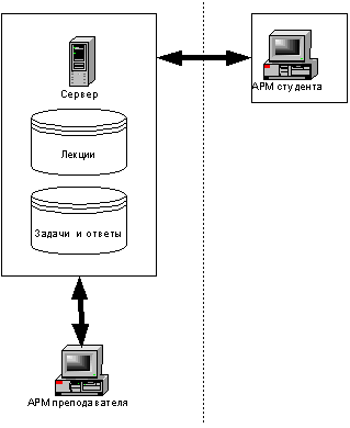 Как уже говорилось ранее, система защиты, разрабатываемая в данной работе, не относится к системам дистанционного обучения, построенных по технологии клиент-сервер. Такие системы уже по определению достаточно хорошо защищены. Все базы данных с материалами для обучения, тестирования и так далее, хранятся на сервере. В нужный момент только часть этих данных попадает на компьютер клиента (см. рисунок 2). В этом случае, например, не требуется защита базы с ответами, поскольку проверка правильности может происходить на серверной стороне. Тем не менее, для такой системы модуль защиты будет также возможно полезен. Так, если на компьютере студента устанавливается некий набор программ, организующий его обучение, то возможно и существование критических мест, где может пригодиться защита исполняемых модулей от модификации кода или другая функциональность модуля защиты.